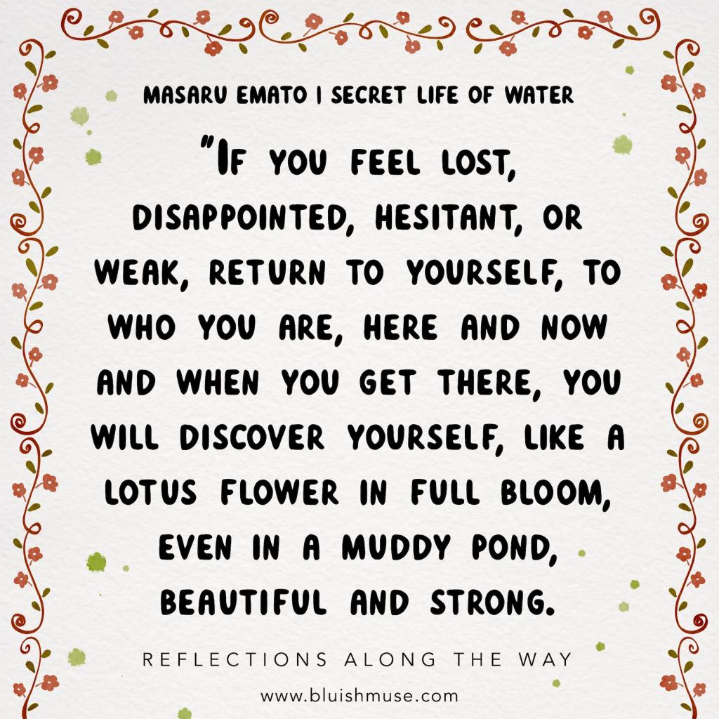 “If you feel lost, disappointed, hesitant, or weak, return to yourself, to who you are, here and now and when you get there, you will discover yourself, like a lotus flower in full bloom, even in a muddy pond, beautiful and strong.”