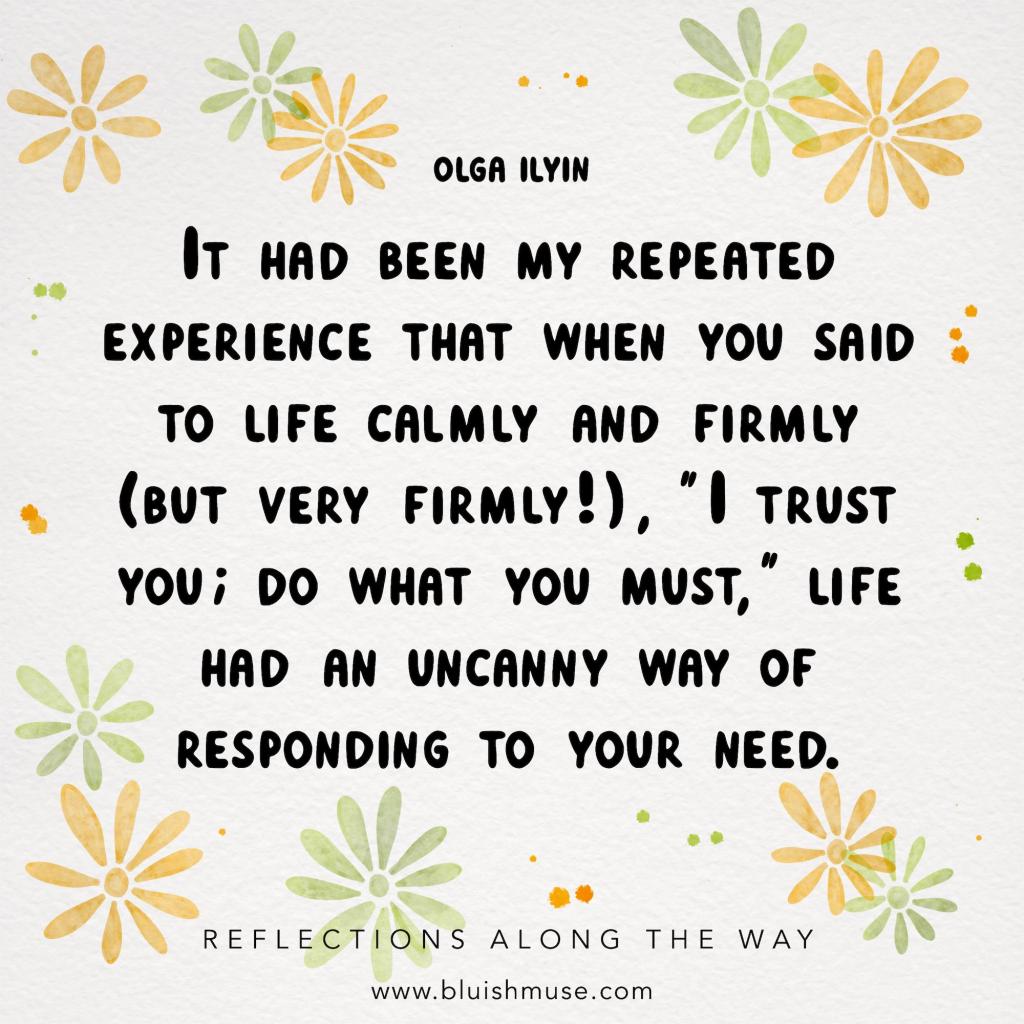 “It had been my repeated experience that when you said to life calmly and firmly (but very firmly!), “I trust you; do what you must,” life had an uncanny way of responding to your need.”
