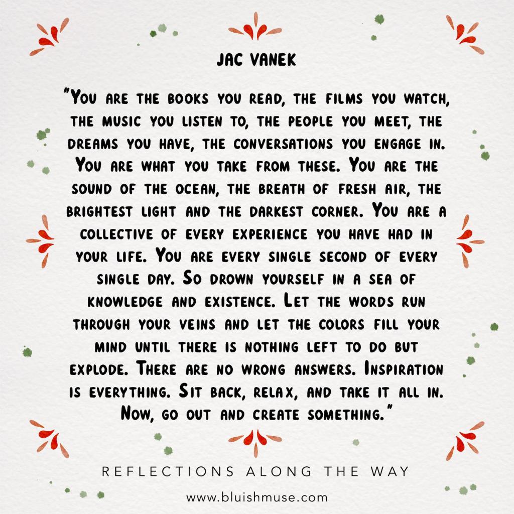“You are the books you read, the films you watch, the music you listen to, the people you meet, the dreams you have, the conversations you engage in. You are what you take from these. You are the sound of the ocean, the breath of fresh air, the brightest light, and the darkest corner. You are a collective of every experience you have had in your life. You are every single second of every single day. So drown yourself in a sea of knowledge and existence. Let the words run through your veins and let the colors fill your mind until there is nothing left to do but explode. There are no wrong answers. Inspiration is everything. Sit back, relax, and take it all in. Now, go out and create something.”